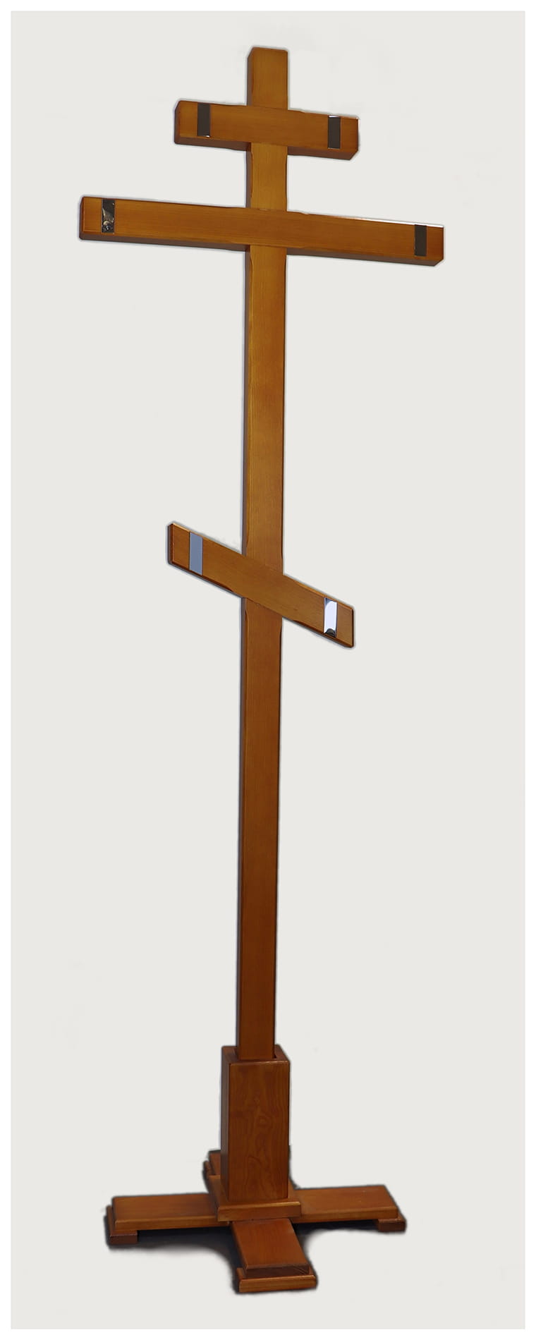 Elegancki drewniany krzyż o tradycyjnej prawosławnej formie tj. o ośmiu końcach. Starannie wykonany, z frezowanymi krawędziami. Ramiona ozdobione eleganckimi akcentami ze stali nierdzewnej z lustrzanym połyskiem. Dostępny w 2 kolorach. Zabezpieczony półmatowym lakierem, odpornym na warunki atmosferyczne.