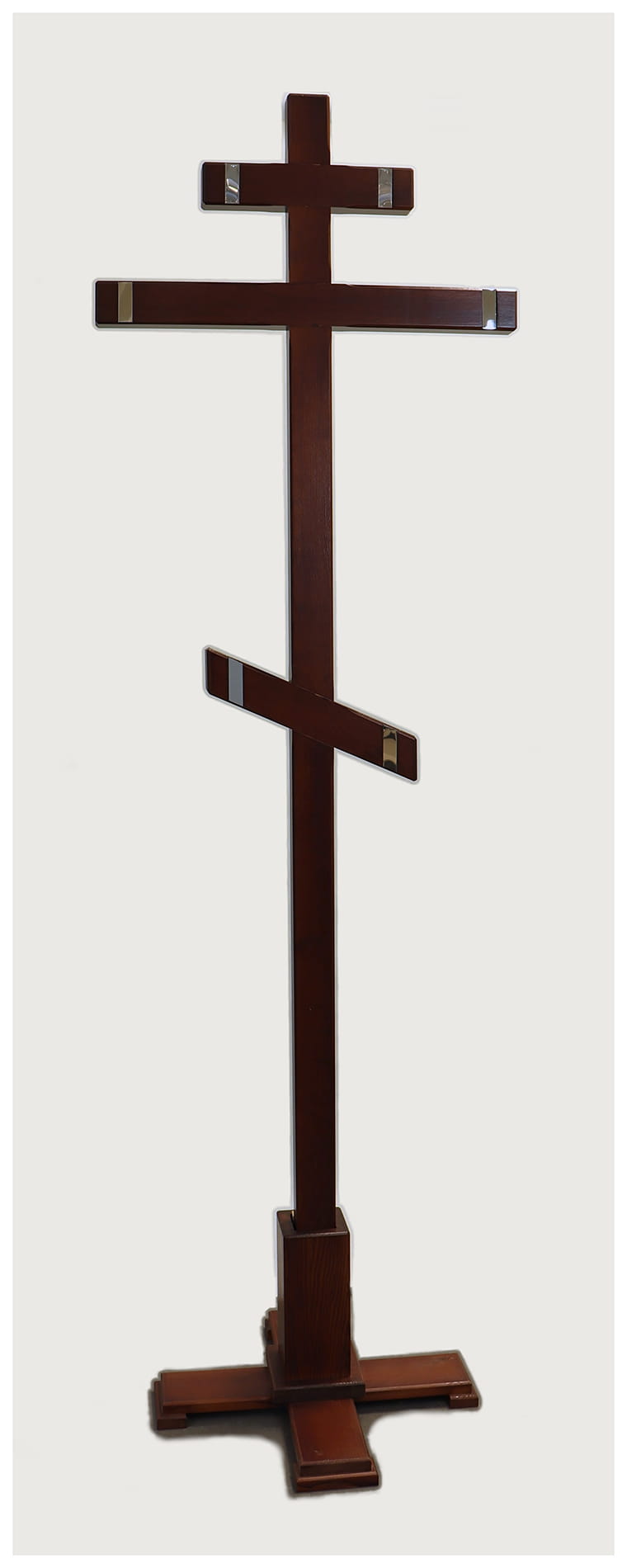 Elegancki drewniany krzyż o tradycyjnej prawosławnej formie tj. o ośmiu końcach. Starannie wykonany, z frezowanymi krawędziami. Ramiona ozdobione eleganckimi akcentami ze stali nierdzewnej z lustrzanym połyskiem. Dostępny w 2 kolorach. Zabezpieczony półmatowym lakierem, odpornym na warunki atmosferyczne.